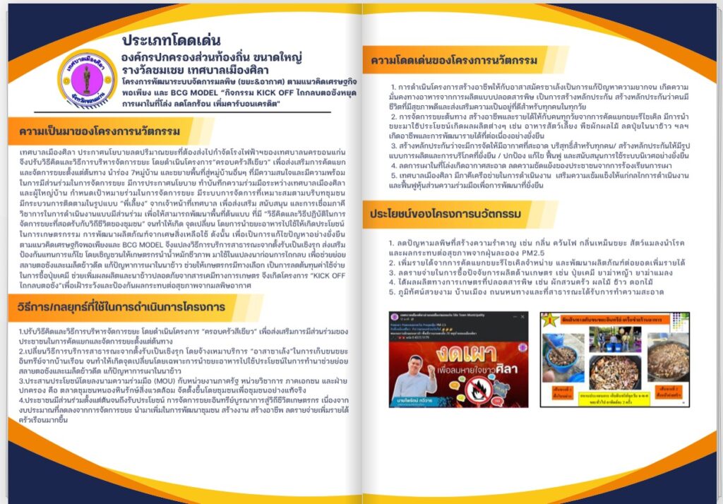เมื่อวันอังคารที่ 8 กรกฎาคม 2568 ดร.พัชรินทร์ ฤชุวรารักษ์ นักวิจัย สถาบันวิจัยเพื่อพัฒนาสังคม มหาวิทยาลัยขอนแก่น ได้รับเชิญจากเทศบาลเมืองศิลาเข้าร่วมกิจกรรมการประเมินองค์กรปกครองส่วนท้องถิ่นที่มีการบริหารจัดการที่ดี ของคณะกรรมการระดับประเทศ ประจำปี 2568 โดยเทศบาลเมืองศิลา นายไพรัตน์ ทวีวาร นายกเทศมนตรีเมืองศิลา ได้นำเสนอผลงานโครงการนวัตกรรมท้องถิ่นด้านการพัฒนาระบบจัดการมลพิษ (ขยะและอากาศ) ณ ห้อง ประชุมยอดขวัญ เทศบาลเมืองศิลา ตำบลศิลา อำเภอเมืองขอนแก่น จังหวัดขอนแก่น มีตัวแทนและภาคีเครือข่ายจากภาคส่วนต่างๆ เข้าร่วมประชุมและเพิ่มเติมข้อมูล อาทิ คณะมนุษยศาสตร์ มหาวิทยาลัยขอนแก่น กรมพัฒนาที่ดิน กรมวิชาการเกษตร โรงพยาบาลศูนย์ขอนแก่น ประชาชนและแกนนำชุมชนจากทุกหมู่บ้านในเขตตำบลศิลา สำหรับสถาบันวิจัยเพื่อพัฒนาสังคมเข้าร่วมในฐานะภาคีเครือข่ายสนับสนุนด้านการจัดการขยะชุมชน และในระยะต่อมาผลของการประเมิน เทศบาลเมืองศิลา ได้รับรางวัลประเภทโดดเด่น องค์กรปกครองส่วนท้องถิ่น ขนาดใหญ่ รางวัลชมเชย ด้านโครงการพัฒนาระบบจัดการมลพิษ (ขยะ&อากาศ) ตามแนวคิดเศรษฐกิจพอเพียง และ BCG Model “กิจกรรม KICK OFF ไถกลบตอซังหยุดการเผาในที่โล่ง ลดโลกร้อน เพิ่มคาร์บอนเครดิต” โดยมีความความโดดเด่นของโครงการนวัตกรรมหลายด้าน ประกอบด้วย 1. การสร้างอาชีพให้กับอาสาสมัครซาเล้ง และเกิดความมันคงทางอาหารจากการผลิตแบบปลอดสารพิษ 2.การจัดการขยะต้นทาง มีการคัดแยกขยะรีไซเคิลและขยะอินทรีย์มาใช้ประโยชน์ที่สามารถสร้างรายได้ให้กับคนทุกวัยอย่างต่อเนื่องและยั่งยืน 3. สร้างหลักประกันให้มีรูปแบบการผลิตและการบริโภคที่ยั่งยืน รวมถึงปกป้อง แก้ไข ฟื้นฟู และสนับสนุนการใช้ระบบนิเวศอย่างยั่งยืน 4. ลดการเผาในที่โล่งเกิดอากาศสะอาด 5. มีการดำเนินงานร่วมกับภาคีเครือข่ายที่ช่วยเสริมความเข้มแข็งให้แก่กลไกการดำเนินงานและฟื้นฟูหุ้นส่วนความร่วมมือเพื่อการพัฒนาที่ยั่งยืน